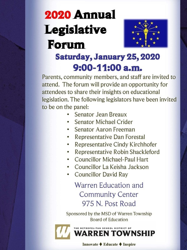 Please mark your calendars and plan to join us on Saturday, January 25, 2020 from 9:00 - 11:00 a.m. The forum will be held at Warren Education and Community Center, 975 N. Post Road, 46219.