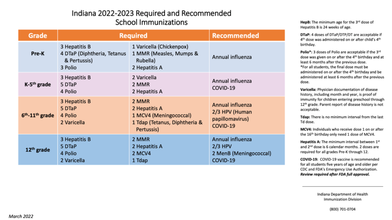 MSD Warren Township, in partnership with the Indiana Immunization Coalition, will be providing a clinic to accommodate immunizations required for school-age children, and the COVID vaccine for individuals 5 years and older, on Monday, July 18, at Moorhead Community Resource Center from 3- 6 p.m. Families are encouraged to pre-register for this event at patients.vaxcare.com/registration. After clicking on the link, enter the enrollment code, IN65942, and then select Warren Schools-7/18. Linked here and below are the required immunizations for school age children for the 22-23 school year.