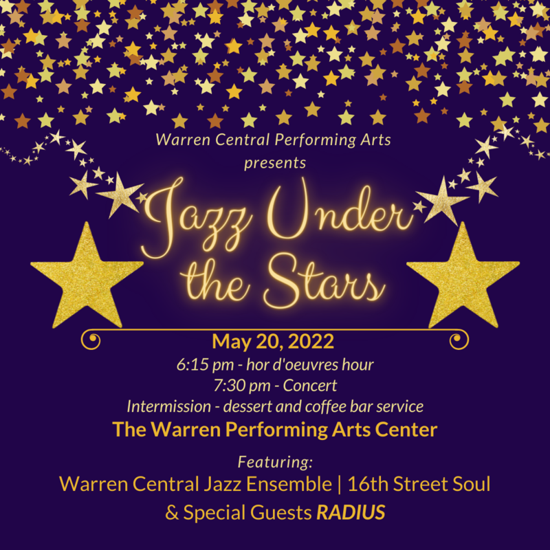 This Friday, May 20, the Warren Central Jazz Ensemble, in collaboration with 16th Street Soul and RADIUS, is proud to present the 2022 Jazz Café: Jazz Under the Stars! Enjoy hor d'oeuvres before the concert and a dessert & coffee bar during the intermission. Food is included with admission; however, tickets must be purchased in advance to secure your seat and food reservation. You won't want to miss this incredible concert! To purchase your tickets, click here.